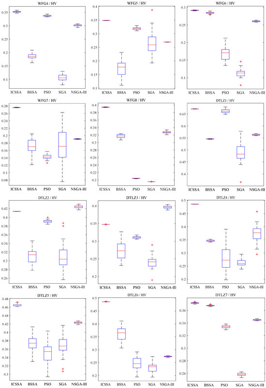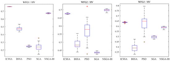 Box plots of HV distribution for ICSSA, BSSA, PSO, SGA, and NSGA-III algorithms.