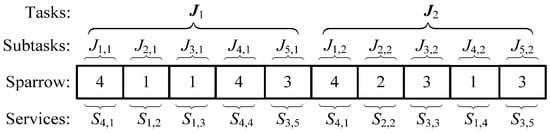 where represents the j-th dimension of the positional vector associated with the i-th sparrow. The numerical value of signifies the specific cloud service chosen from the candidate set Sj for task Jj during the process of SvcComp. NumSpa denotes the overall count of sparrows within the sparrow group. Additionally, Figure 2 illustrates the correlation between the sparrow and the SvcComp. Furthermore, m corresponds to the dimensionality of the sparrow variable . The sparrow code values in Figure 2 represent calling the corresponding green service options and using the corresponding green manufacturing resource options.