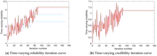 The program of the ICSSA is written in MATLAB R2015a. The execution time constraint ETthreshold is 500 h, and the execution cost constraint ECthreshold is USD 70,000. The sparrow population NumSpa comprises 50 individuals, and the maximum iteration count MaxIteNum is set to 180. Γ = 99 and λ = 0.5. The weight coefficients for six objective functions are designated as δ1 = δ3 = δ5 = δ6 = 0.2 and δ2 = δ4 = 0.1. After 87 iterations, the ICSSA converges and the population optimal fitness value is 99.101. In the corresponding optimal SvcComp scheme, the time-varying service reliability is 6.161, the composition complexity is 8.81, the time-varying service credibility is 7.085, the composition synergy is 40.854, the execution time is 182 h, and the execution cost is USD 33,921. The optimal SvcComp scheme is represented by the sparrow position code 4114342313. The code’s interpretation, as depicted in Figure 6, is as follows: for the first DR manufacturing task J1,1, the fourth cloud service from set S1 is selected; for J2,1, the first service from S2 is selected; for J3,1, the first from S3 is selected; for J4,1, the fourth from S4 is selected; and for J5,1, the third from S5 is selected. Similarly, for the second DR manufacturing task, J1,2 selects the fourth service from S1; for J2,2, the second from S2 is selected; for J3,2, the third from S3 is selected; for J4,2, the first from S4 is selected; and for J5,2, the third from S5 is selected. The average execution time stands at 18.73 s, and the iteration curves pertaining to its key parameters are exhibited in Figure 7. Figure 7a shows the time-varying service reliability iteration curve; Figure 7b shows the time-varying service credibility iteration curve. When the sparrow population iterates to the 87th iteration, the algorithm tends to be stable. The optimal individual fitness iteration curve is shown as the red curve in Figure 8.