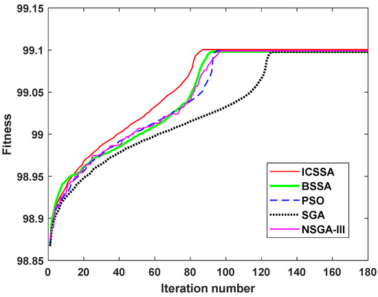 Comparison of ICSSA, BSSA, PSO, SGA and NSGA-III iteration curves.