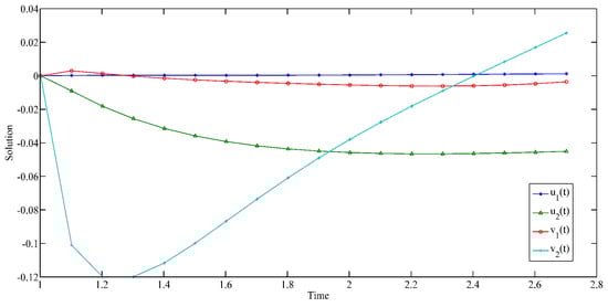 In Examples 1 and 2, and are all rational numbers. To further verify the correctness of our results and the sensitivity of the numerical simulation to the parameters, we chose some irrational numbers and satisfying in Example 3.