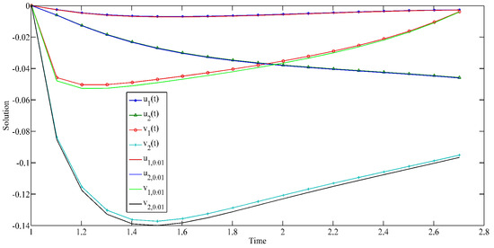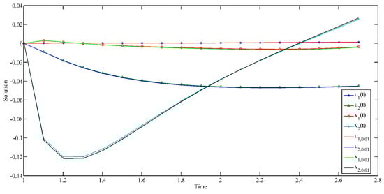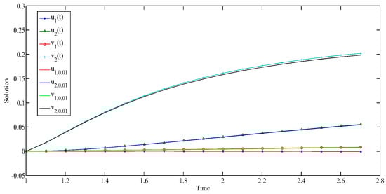 We can use the appropriate ODE toolbox in MATLAB to complete numerical simulations of (22). Based on the above analysis, we employ the ODE113 toolbox in MATLAB R2017b on the three examples to present numerical simulations of their solutions and GUH stability. The simulation diagrams are shown in Figure 1, Figure 2, Figure 3, Figure 4, Figure 5 and Figure 6.