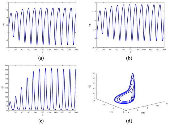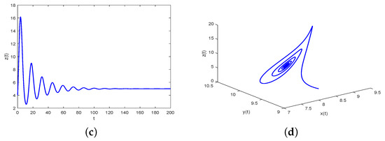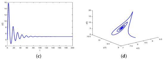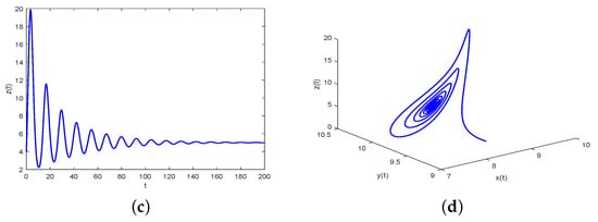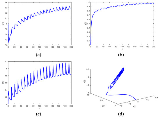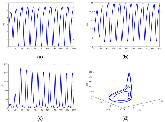 Figure 6. Waveform plots and phase portrait of system (38) with τ 1 = 1 > τ 10 = 0.5956 . (a) represents waveform plot of x ( t ) for system (38). (b) represents waveform plot of y ( t ) for system (38). (c) represents waveform plot of z ( t ) for system (38). (d) represents phase portrait of x ( t ) , y ( t ) and z ( t ) for system (38).