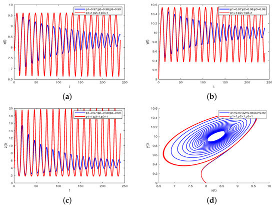 Figure 7. Comparison of convergence for system (38) with p 1 = 0.97 , p 2 = 0.98 , p 3 = 0.99 , and τ 1 = 0.4 < τ 10 = 0.5956 versus integer-order tumor-lymphatic model. (a) represents waveform plot of x ( t ) for system (38). (b) represents waveform plot of y ( t ) for system (38). (c) represents waveform plot of z ( t ) for system (38). (d) represents phase portrait of x ( t ) , y ( t ) and z ( t ) for system (38).