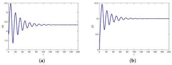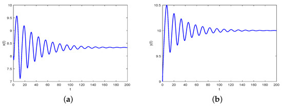 This section provides a typical numerical example to illustrate the validity of our theoretical results. In this example, we use time delays as the bifurcation parameter to examine the dynamical behavior of system (4). The simulation results all are based on the Adama–Bashforth–Moulton predictor-corrector scheme [26] and step-length . To facilitate comparison, we consider system (4) with , , , and , which are taken from the literature [14]. As a result, system (4) takes the following form: