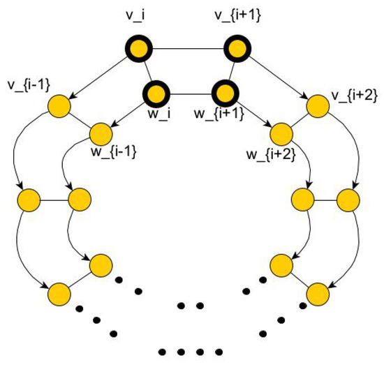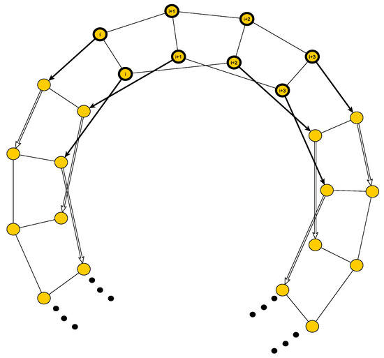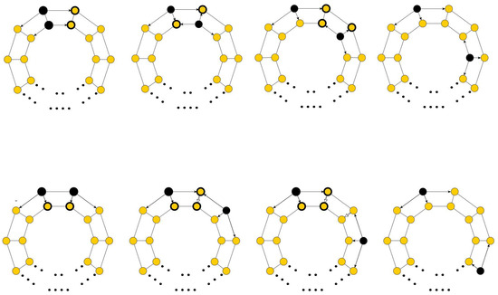 Observe that once the vertices are observed, then each of , and have a unique unobserved neighbour, namely, and , respectively. These can be observed by propagation step 1. Further, by similar reasoning, propagation steps can be followed to observe the entire graph. An illustration is shown in Figure 4. The darkened vertices are and the arrows show the propagation steps. □