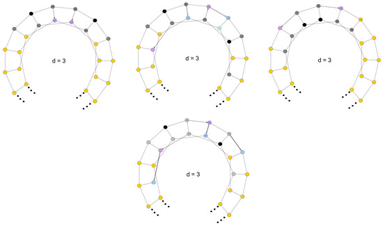 According to Lemma 2, two PMUs within a distance of less than four can always monitor . Therefore, our objective is to construct the largest subset of vertices of such that the pairwise distance between any two vertices in the set is greater than or equal to four. To achieve this, we begin by selecting an arbitrary vertex of the graph (without loss of generality, we start from an outer vertex) and then proceed to select vertices that are exactly distance four apart from each other. The distance is taken as the minimum, specifically four, to maximize the number of vertices, thus obtaining the largest required set. This process results in the following sets: For any and