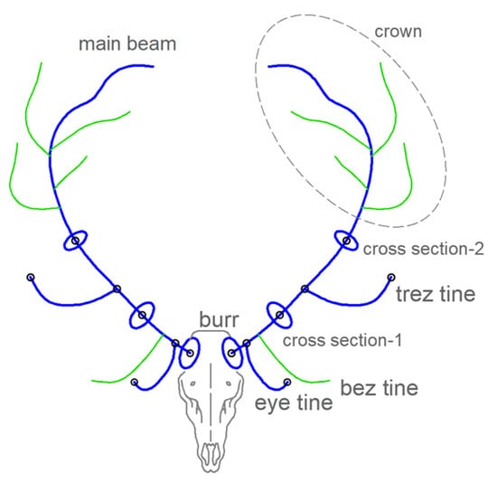 In the proposed analysis, the starting data are the characterisation of the antler in a 3D CAD model of its axial structure, which faithfully describes the geometric elements of its structure: main beam, main tines (eye tines and trez tines), and the cross-sections of relevant parts of the main beam of the antler (Figure 2).