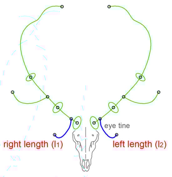 More recent studies have evaluated asymmetry values, not as an overall value but as partial values for the differential traits of antler structures [14,15,21]. To a lesser extent, an overall value of asymmetry is evaluated and estimated for the entire antler [20,36].