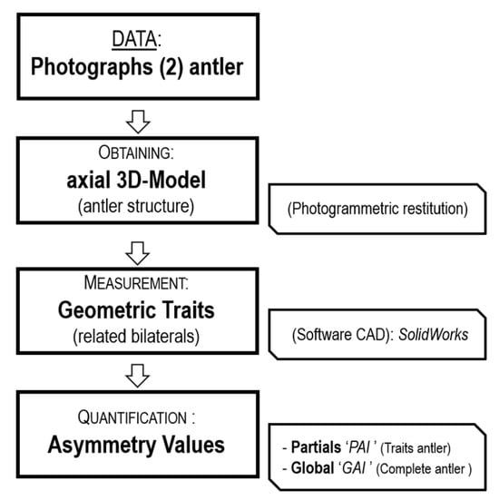 The new methodology presented in this study allows for a more direct application since it does not consider the previous definition of a symmetry plane. It will consider the divergences of the measurements on average of different related structural traits of the two branches of the antler of the Iberian deer (Cervus elaphus hispanicus). With these values of partial asymmetries, a global value of asymmetry for the whole antler structure is finally obtained. For the analysis, the characterisation of the antler is used as a 3D model of its axial structure. The algorithm takes advantage of the measurements considered for the assessment of the degree of hunting quality [41].