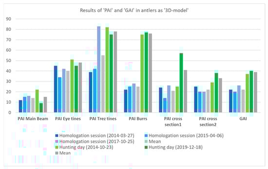 The assessment analysis of the partial asymmetry (PAI) and global asymmetry (GAI) values of all the specimens evaluated was carried out on the input data of the antler characterised via its 3D CAD model (Table 4) (Figure 5). The results show the arithmetic mean of the PAI and GAI values in the specimens of each of the samples, corresponding to the three ‘homologation sessions’ and the two ‘hunting days’.