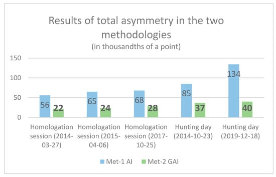 On the new proposed methodology, ‘Met-2’, the results obtained are convergent with those obtained in ‘Met-1’, each within its own scale of results. The values of asymmetry in the specimens from ‘homologation sessions’ are somewhat lower than those from ‘hunting days’: 57% in ‘Met-1’ and 61% in ‘Met-2’.