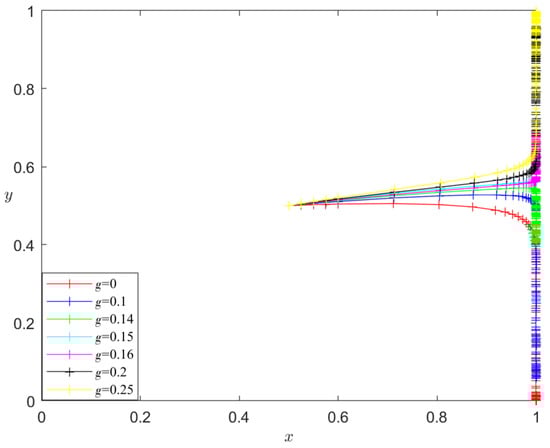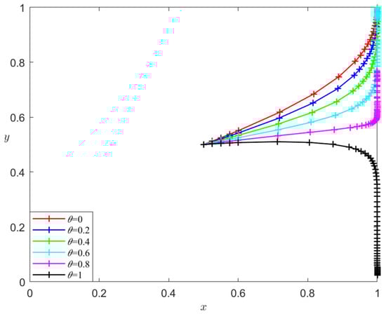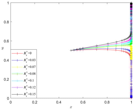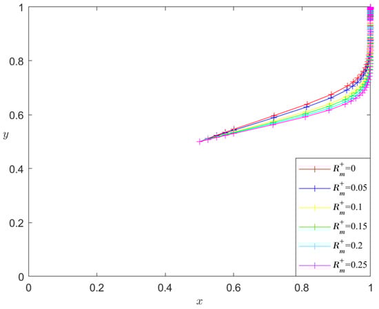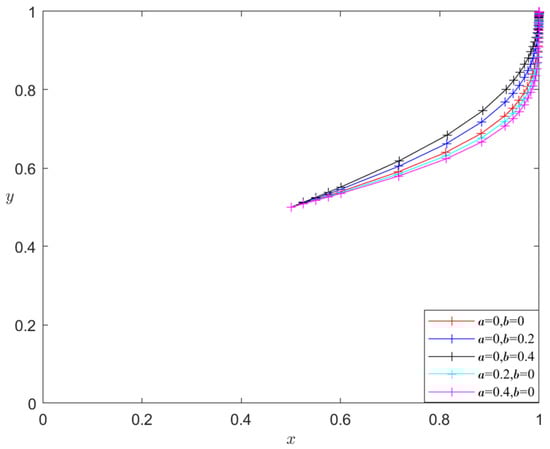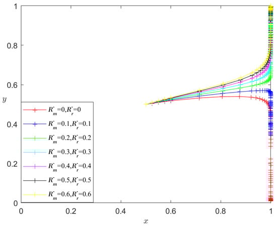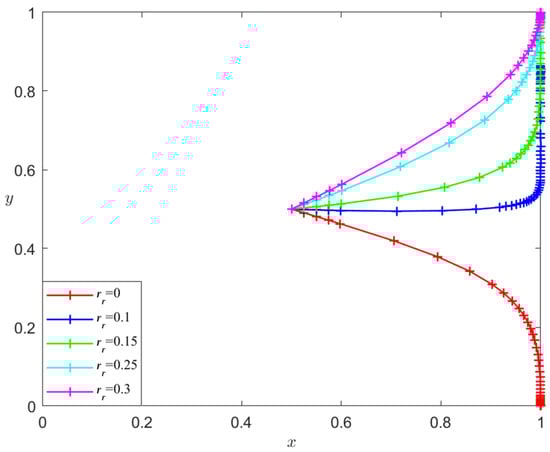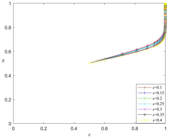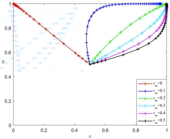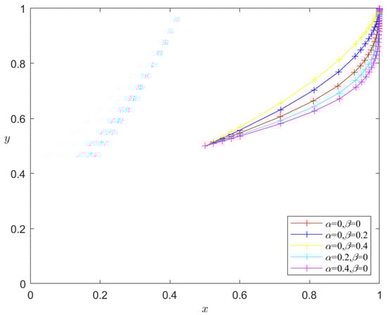 In the case when increases from 0.2 to 0.5 while other parameters remain unchanged, the simulation results are shown in Figure 19. When = 0.5, the MSR chooses the “resilience non-investment” strategy due to the higher “free-rider” benefits and decreased disruption losses that can be achieved through unilateral resilience investment by the MSM. At this point, the system satisfies constraint ⑤ and will eventually evolve to (1,0). When = 0.4, the probability of the MSR choosing the resilience investment strategy evolves to around 0.6; when = 0.3 or 0.2, as the “free-rider” benefits decrease, the MSR gradually abandons the “free-rider” strategy and prefers the “resilience investment” strategy. The system eventually evolves to (1,1). This suggests that reductions in “free-rider” benefits steer retailers toward resilience investment strategies. In the case when increases from 0.2 to 0.4, it can be seen from Figure 19 that as the value of increases, the MSR chooses the resilience investment more quickly. This indicates that more potential costs gained through the MSM’s unilateral resilience investment lead to a faster evolution of the MSR select “resilience investment” strategy. When the MSM engages in unilateral resilience investment, replacing the original MSR with a new MSR enhances the motivation for the original MSR to invest in resilience.