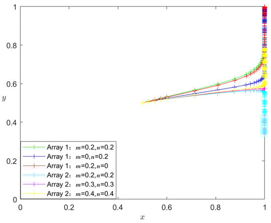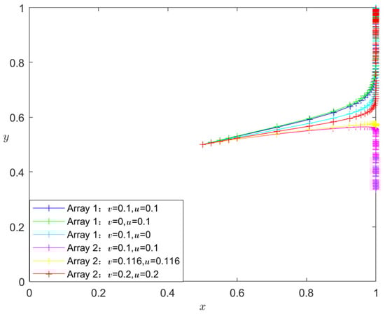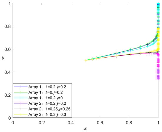 Array 2: . Holding all other parameters constant, Figure 17 displays the simulation results when and increase from 0 to 0.1. When = 0.1 and = 0.1, the probability of the MSR choosing the “resilience investment” strategy evolves toward a value less than 0.5 because the loss of SC disruption decreases, and the reduction of additional unit cost due to resilience investment decreases. When = 0.116 and = 0.116, the MSR has a probability of choosing a “resilience investment” strategy near 0.6. When = 0.2 and = 0.2, the MSR chooses the “resilience investment” strategy as the degree of reduction in additional unit cost caused by resilience investment rises, condition ⑥ is satisfied. Therefore, the degree of reduction in additional unit cost from resilience investment directly impacts the motivation of the MSR to engage in resilience.