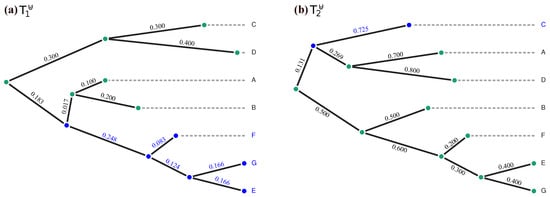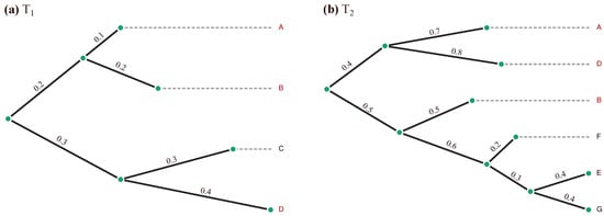 The following example illustrates the tree completion procedure within the proposed algorithm. Consider the trees and in Figure 1. The tree completion process can start with either or due to the symmetry property (see Proposition 1). In this example, the tree is completed first. All subsequent results are rounded to three decimal places.