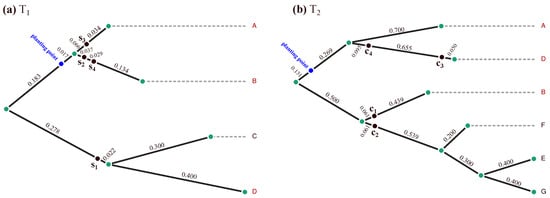 Temporary nodes and planting points. Temporary nodes are marked in black for both trees. Tree (a) has 4 temporary nodes (denoted as , , , and in (a)). Tree (b) also contains 4 temporary nodes (labeled as , , , and in (b)). The planting points found using Algorithm 2 are marked in blue.
