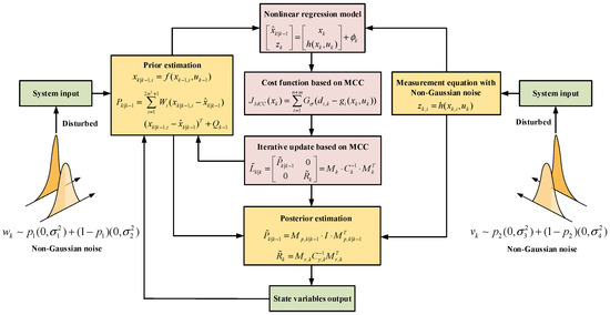 The SVDGHCKF algorithm, which is based on MCC, is developed to address the issue of the HCKF algorithm being prone to divergence and non-positive definite when working with non-Gaussian noise. In a non-Gaussian noise environment, MCC can improve the estimator’s resilience and accuracy. Figure 2 illustrates the MCSVDGHCKF algorithm’s block diagram.