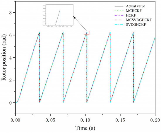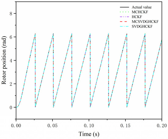 Figure 7 and Figure 8 show the comparison curves of rotor speed and position estimated by different comparison algorithms and the MCSVDGHCKF algorithm under a step condition of 80 km/h. Under the step condition of a higher speed and faster steering wheel change, the MCSVDGHCKF has better estimation accuracy and robustness than MCHCKF, SVDGHCKF, and HCKF. The MCSVDGHCKF shows good performance in non-local sampling and divergence of high dimensional systems for PMSM state estimation.
