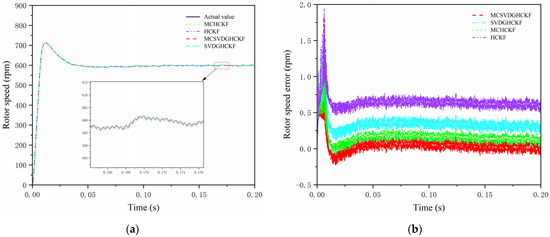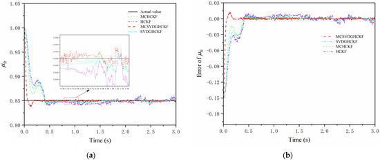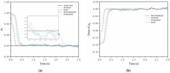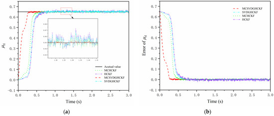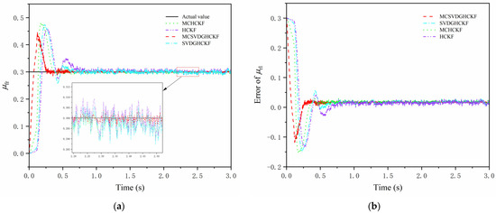 Figure 10 and Figure 11 show the simulation results of steering drive conditions with a constant friction coefficient. As can be seen from Figure 10a and Figure 11a, although there is a certain overshoot in the initial stage, all four algorithms can converge to the set value within 0.5 s, and the error after stabilization is less than 0.015. When a PMSM is used for sensorless control, MCHCKF has higher accuracy and faster response than SVDGHCKF and HCKF, reflecting the advantages of MCC in non-Gaussian noise environments, while MCSVDGHCKF has the smallest overshoot at the beginning and the fastest convergence to the true value. As can be seen from Figure 10b and Figure 11b and Table 3, the overall accuracy of MCSVDGHCKF estimation is higher than that of MCHCKF, SVDGHCKF and HCKF; the RMSE of TRFC estimates for the right front wheel and the left rear wheel reduced by at least 41.36% and 40.63%, indicating that MCSVDGHCKF has higher estimation accuracy and stronger robustness in non-Gaussian heavy-tail noise environment, and can adapt to harsh high-dimensional systems.