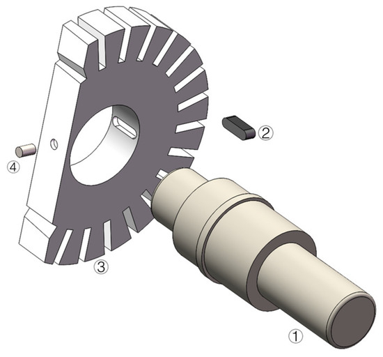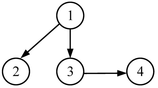 Figure 1 illustrates a 3D model of a partial structure of a gear transmission device, which comprises four parts. It can be observed that, once the shaft (1) is removed, the key (2) or the flywheel (3) can be taken out. After the flywheel (3) is removed, the counterweight (4) can be disassembled, completing the entire disassembly process. Its disassembly-precedence graph is shown in Figure 2. In Figure 2, disassembly tasks 1, 2, 3, and 4 constitute the basic disassembly unit set. There are clear precedence constraints between tasks 1 and 2, tasks 1 and 3, and tasks 3 and 4; these relationships are represented by the directed edge set. For example, task 1 must be completed before task 2, the start of task 3 depends on the completion of task 1, and task 4 needs to be carried out after task 3.