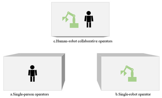 In the disassembly process, the rational allocation of disassembly tasks to achieve the set DLB objectives is key to improving the efficiency and production capacity of the disassembly line. Therefore, the primary goal of this paper is to rationally allocate disassembly tasks to various workstations. In addition, with the introduction of robots, the operators of the workstations are classified into single-person operators, single-robot operators, and human–robot collaborative combination operators, as shown in Figure 3.