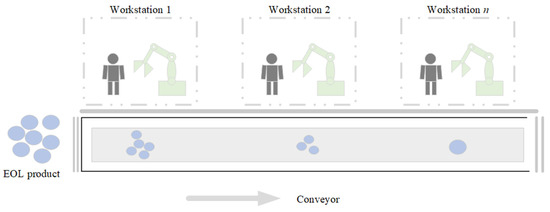 - Liu, B.; Xu, W.; Liu, J.; Yao, B.; Zhou, Z.; Pham, D.T. Human-robot collaboration for disassembly line balancing problem in remanufacturing. In Proceedings of the ASME 2019 14th International Manufacturing Science and Engineering Conference, Erie, PA, USA, 10–14 June 2019; American Society of Mechanical Engineers: New York, NY, USA, 2019; p. V001T02A037. [Google Scholar]