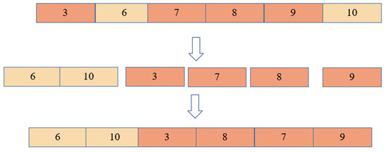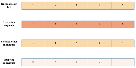 In metaheuristic algorithms, population initialisation is a key step for ensuring the algorithm’s effectiveness [34]. To generate feasible initial populations, we use a dual-layer encoding mechanism to represent the problem’s solution. In this mechanism, the first layer of encoding uses integers to represent each task, and the order of these integers clearly defines the execution order of the tasks. For example, the sequence one, two, three, four indicates that the tasks will be disassembled in the order of one, two, three, and four. To meet the precedence constraints between tasks, we first transform the disassembly-precedence graph into matrix , and then use the following process to generate a feasible disassembly sequence: