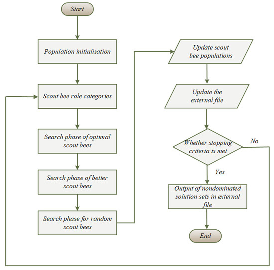 Similar to the traditional BA, the assignment of scout-bee roles is crucial in the initial phase of the proposed MODBA [32]. Faced with the complex challenge of multiobjective optimisation, we first set an initial population consisting of scout bees (individuals). These initial individuals then undergo a comprehensive evaluation process that includes fast non-dominated sorting and crowding-distance calculation [35].