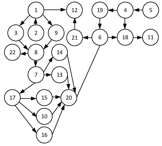To apply the disassembly-precedence graph in the modelling process, it needs to be converted into a matrix form, which can be defined as the precedence matrix . The disassembly-precedence graph in Figure 2 can be transformed into the following form: