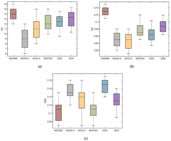 These metrics together provide a comprehensive assessment of the algorithm’s performance, including solution quality, diversity, and closeness. To ensure fairness, we set the running time for all algorithms to 120 s, which allows ample time for each algorithm to thoroughly explore the solution space, and the population size to 50, with other parameters set according to the relevant literature. Additionally, we adopt the same decoding and encoding methods. It is worth noting that, to overcome the randomness of heuristic algorithms, we run each algorithm 15 times and report the average values, as shown in Table 8. Furthermore, Figure 10 displays the statistical results using box plots.