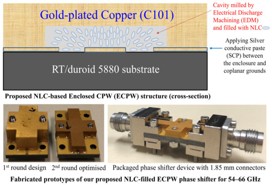 - Li, J.; Chu, D. Liquid Crystal-Based Enclosed Coplanar Waveguide Phase Shifter for 54–66 GHz Applications. Crystals 2019, 9, 650. [Google Scholar] [CrossRef]