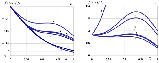 Small values of are characterized by the presence of the local maximum at point 0.775 for small values of (curve 1, Figure 16a) and at point 0.7 for large values of (curve 1 in Figure 16b). Here, the value of the maximum increases approximately twice: 2.13. With the increasing values of , for small times, the function becomes concave (curves 3–5 in Figure 16a), and for large times, it becomes convex (curves 3–5 in Figure 16b).