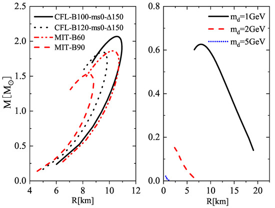 The mass−radius relations of pure SSs under various EOSs (left panel) and pure DMSs with various DPM (right panel).