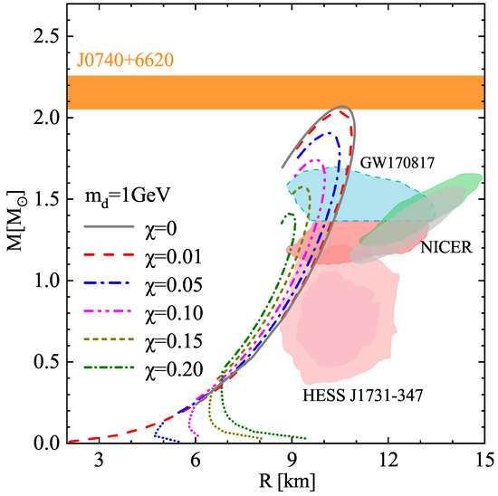 The mass−radius relations of DMASSs. We take the EOS of SQM as CFL−B100−ms0 150. DPM is taken as GeV, and the fractions of DM in DMASSs are taken from 0 to 0.2. The shaded portion shows the constraints on the mass–radius relation given by the heaviest pulsar observed PSR J0740+6620 [86], the light compact object HESS J1731-347 [19] and analyses of GW170817 [87] and NICER [88] observations.