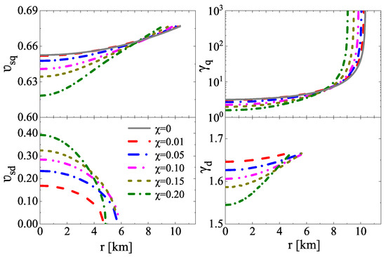 Profiles of speed of sound (left panels) and adiabatic index (right panels) of SQM (upper panels) and DM (lower panels) in SSs and DMASSs with 1.4. The is taken as 1 GeV and the fractions of DM are taken as , respectively.