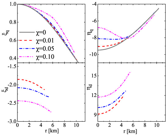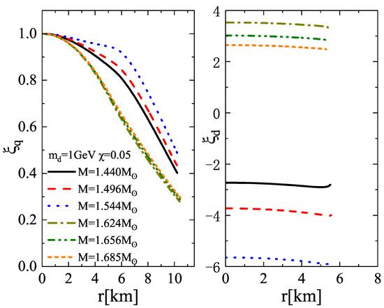 As can be seen from the figure, all have no nodes, as expected. The amplitudes of SQM are quantitatively similar to the results in ref. [56]. drops monotonously from the center to the surface, and it decreases a little slowly as increases. increases monotonously from the center to the surface when is quite small. However, the central value of increases as increases, while the surface value decreases a little. As a consequence, gradually becomes nonmonotonic, with a minimum around half of the radius. The amplitudes of DM and are at the same order as the amplitudes of SQM, but have the opposite signs of and , respectively. As the radius increases, and vary a little from center to the DM surface . With the increase in , the varying of and is monotonic, decreases, and increases.