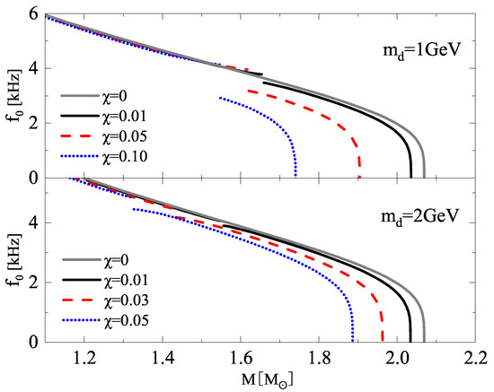 We further show the radial oscillation frequencies () as functions of DMASS masses in Figure 6. For pure SSs, decreases monotonically and continuously as the SS mass increases, and drops to 0 at the maximum mass. In comparison, when the stellar mass is low, the oscillation frequencies of DMASSs are almost the same as SSs, only slightly suppressed by DM, which is qualitatively similar to ref. [56]. However, in the high-mass region, DM significantly suppresses the radial oscillation frequencies of DMASSs. When the stellar mass approaches the maximum mass, the radial oscillation frequency of DMASSs also drops rapidly to 0. When the central pressure of SQM increases further, the mass of DMASSs decreases and the radial oscillation frequencies become negative, i.e., is no longer a real number. Then, a small perturbation of the star could increase exponentially, and the star becomes unstable.