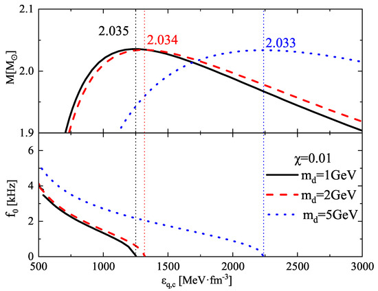 The dependence of mass (upper panel) and radial oscillation frequency (lower panel) on the central energy density of SQM in DMASSs with various DPMs. The DPM GeV respectively, and the mass fraction of DM is .