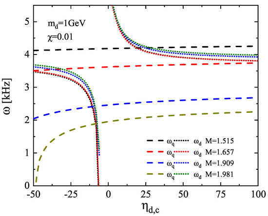 The frequencies and as functions of the test for various masses of DMASSs. We take DPM GeV and .