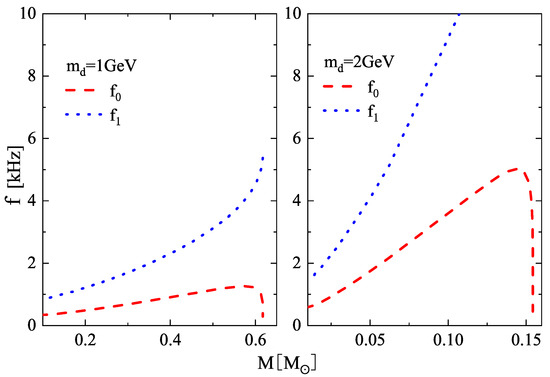 Regarding to the mechanism for the discontinuity in the radial oscillation frequencies of DMASSs, a possible explanation may come from the coupling between different oscillation modes of pure DM stars and the fundamental mode of SSs. We show both the fundamental mode frequency and the first excited mode frequency of pure DM stars in Figure 10. One can see that the of DM stars is just slightly higher than . In the high-mass region, of SSs are small and close to of DM stars, and they couple to produce a small oscillation frequency of a DMASS. However, in the low-mass region, of SSs increases to be much higher than that of DM stars, and is closer to of DM stars. This may result in that of SSs prefers to couple with of DM stars, producing a larger of a DMASS. In a word, of SSs may select to couple with () of DM stars in the high (low)-mass region, which leads to the discontinuity of oscillation frequencies in different mass regions of DMASSs. Moreover, as compared to the case with smaller DPM as shown in the left panel, and of DM stars are higher for larger DPM as shown in right panel. This is consistent with the corresponding discontinuities in of DMASSs, which also emerge at higher values for larger DPM, as shown in Figure 6.