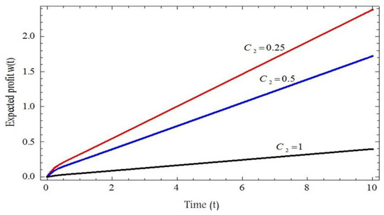 In Table 1, we can see that as the operating time increases, the availability function and the reliability function start to decrease. Table 2 also examines the effect of operating time on the profit function with constant revenue () and a change in repair cost (). The lower the repair costs with increasing operating time, the greater the expected net profit function.