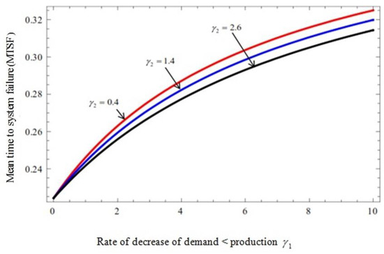 Figure 5 presents the impact of both the rates of decrease in demand < production () and increase in demand ≥ production () on the MTSF. As increases and decreases, the MTSF increases. Figure 6 shows that the MTSF decreases as increases but increases with a decrease in . Table 3, Table 4, Table 5 and Table 6 provide the system parameters. The order of system sensitivity was determined as follows: