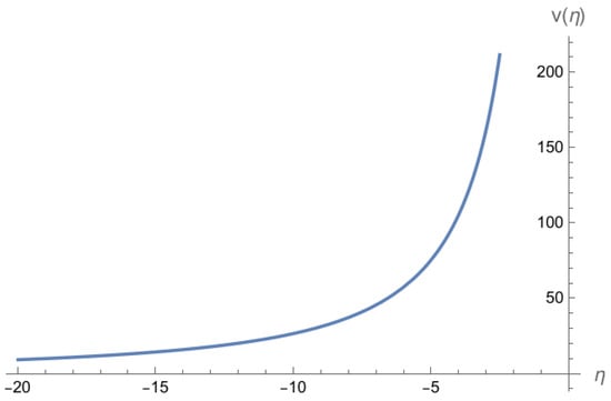 Plot of the computed dBB trajectory (25) in conformal time. As an effect of the quantum correction, the variable remains above the axis and does not reach zero. We use as reference values and to properly describe the perturbative regime.