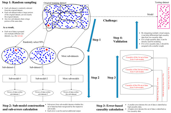 Calculate the average error ep,avg using multiple sub-errors from Step 2 as the basis for calculating the data causality δ. Specifically, if δp of the pth set of data is relatively high, i.e., ep,avg is low, it denotes that such data can be recognized by multiple sub-models, and by extension, such data should be recognized as high-causality data; if δp of the pth set of data is relatively low, i.e., ep,avg is high, then such data should be recognized as low-causality. More details can be found in Section 2.5.