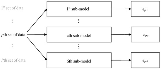 With the selected baseline machine learning approach and its parameters, a total of S sub-models are constructed using S sub-datasets, which is a repeated and independent process. The error of the pth set of data from the sth sub-model is ep,s, as in Figure 2.