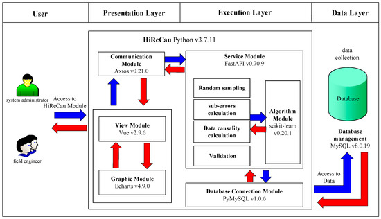 As a key part of HiReCau, the Algorithm module performs the proposed method, including random sampling, sub-error calculation, data causality calculation, and validation (see Section 2). Concerning the information flow, the Algorithm module performs the requests from the Service module and specifies more search requests, which are then forwarded to the Database Connection module. The Algorithm module is implemented via scikit-learn which is a machine learning base by Python where many machine learning approaches have already been built-in, including the support vector machine (SVM), the random forest (RF), and the neural network (NN). scikit-learn is well known for its convenience and good encapsulation, which can reduce the involvement of human interference while providing multiple interfaces.
