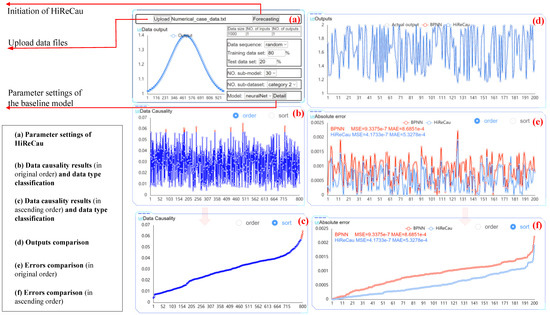 Figure 6 shows the parameter settings part and results of a random run. As depicted in Figure 6b,c, the data causality calculation results indicate that 3% of the 400 data points were identified as low-causality data, representing the HiReCau (3%) approach. Figure 6d compares the outputs, while Figure 6e,f present a comparative analysis of the errors. Based on the data presented in Figure 6, it is evident that HiReCau generally outperforms the direct application of BPNN. For instance, the mean squared error (MSE) is reduced from 7.3106 × 10−4 with BPNN to 4.8390 × 10−4 with HiReCau, representing a 33.81% improvement. Similarly, the mean absolute error (MAE) decreases from 1.7472 × 10−2 with BPNN to 1.5112 × 10−2 with HiReCau, yielding a 13.51% improvement.
