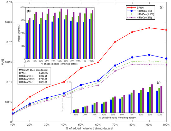 Overall, HiReCau has consistently achieved significantly lower mean absolute errors (MAEs) compared to BPNN in all conditions where there are different percentages of added noise. For instance, in the case of 10% added noisy data, the MAE of HiReCau (1%) stands at 2.1109 × 10−3, while BPNN’s MAE is 3.0280 × 10−3. As the noise level increases to 100% added noisy data, the MAE of HiReCau (1%) rises to 1.5866 × 10−2, still notably lower than BPNN’s MAE of 2.3010 × 10−2. These findings underscore the overall superiority of HiReCau over direct BPNN.