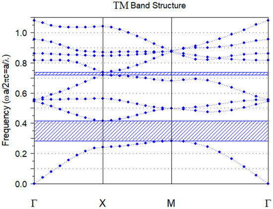 A structure consisting of silicon rods in air is considered for the design of the optical XOR gate. The lattice constant in this structure is chosen equal to a = 600 nm. The radius of the rods is also considered to be r = 0.2a. The TM photonic bandgap structure of the proposed XOR optical gate with photonic crystals is shown in Figure 1. According to calculations, the bandgap structure is in the normalized range of 0.28 < a/λ < 0.42, which is a wide bandgap. The equivalent wavelength of this range is 1.42 < λ < 2.14 micrometers. The working wavelength of the presented gate is 1.55 micrometers, which is the telecommunication wavelength.