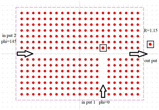 The initial structure of the all-optical XOR gate is shown in Figure 2. In this structure, Si rods with a refractive index of 3.46 were used in the air; this layout was created by completely removing a row of rods in the vertical direction and removing a number of rods in the horizontal direction, which created waveguides for inputs 1 and 2. As can be seen from Figure 2, a defect bar is created, whose dimensions can be obtained using the results and determined by the machine learning method, providing the most optimal value. Also, the phi parameter is assumed to be optimized using the proposed neural network model.